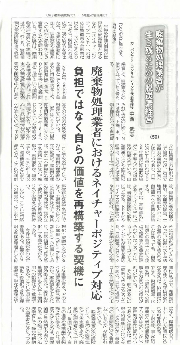 弊社代表中西の『脱炭素経営』講座が掲載されました(環境新聞3月11日4面)