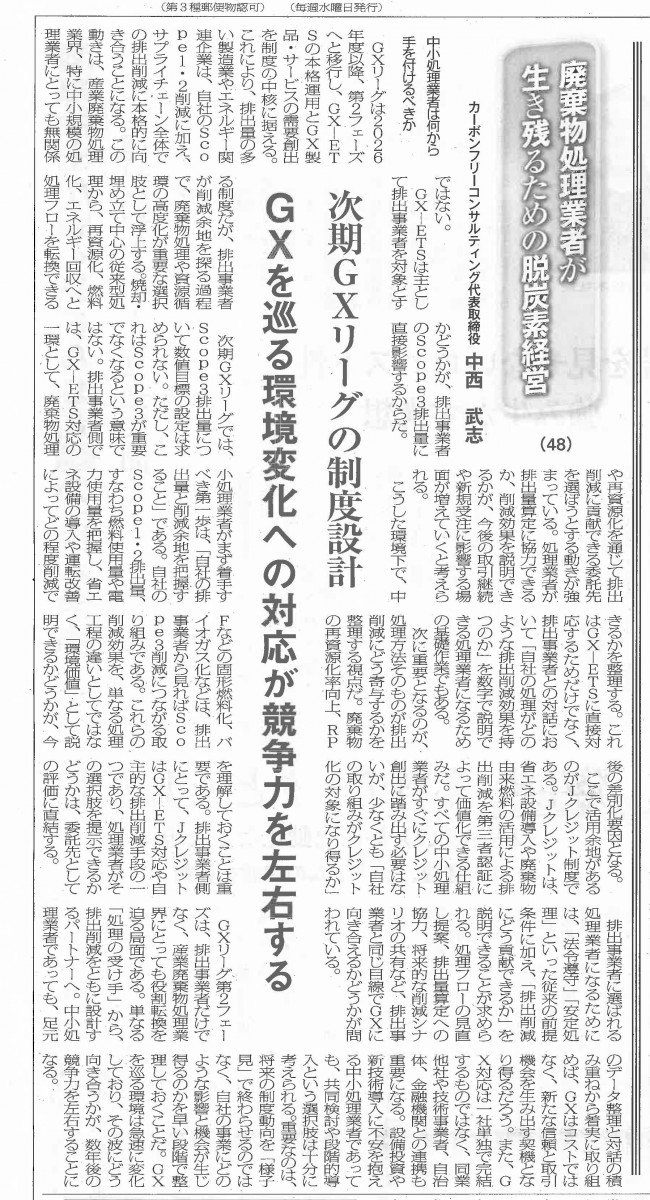 弊社代表中西の『脱炭素経営』講座が掲載されました(環境新聞1月14日4面)